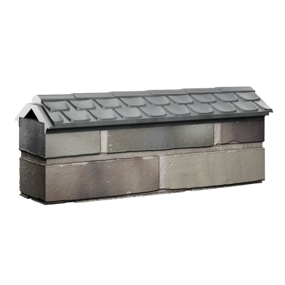 Парапет Elbrus Серый 175 х 510 х 65 мм с посадкой на 0.5 кирпича (130 мм) под натуральную черепицу может быть применен как в цокольной, так и в верхней части забора в виде конька.